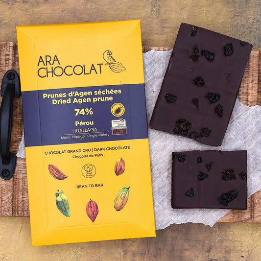 Ara Chocolat Huallaga Peru 74% Dark Chocolate Bar with Agen Prunes