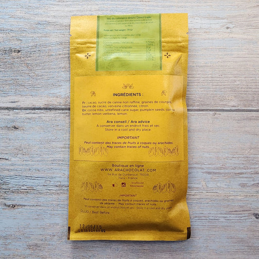 Ara Chocolat Pumpkin Seed and Lemon Verbena 74% Dark Chocolate Bar