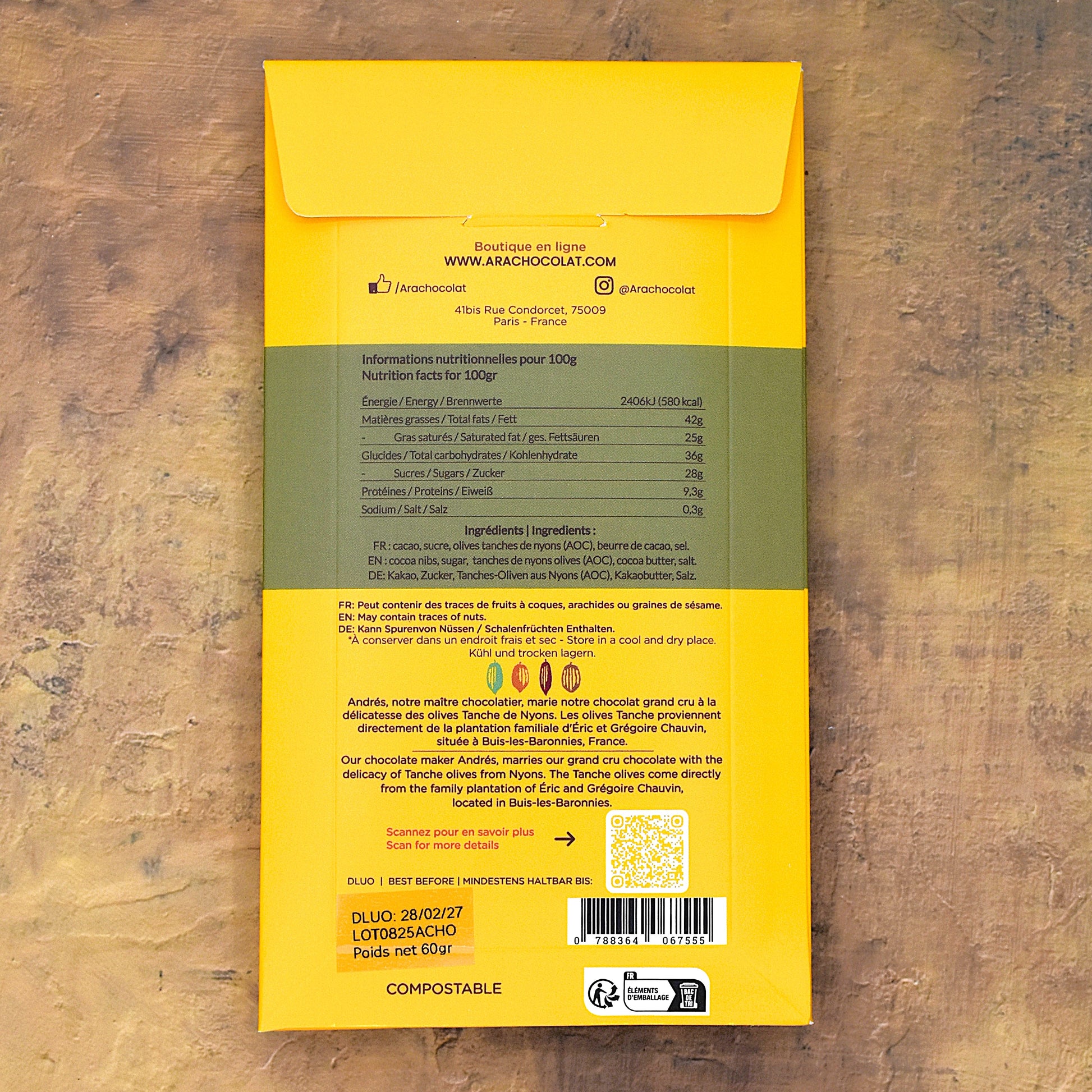 cocoa nibs, unrefined sugar, tanches de nyons olives (AOC), cocoa butter, salt