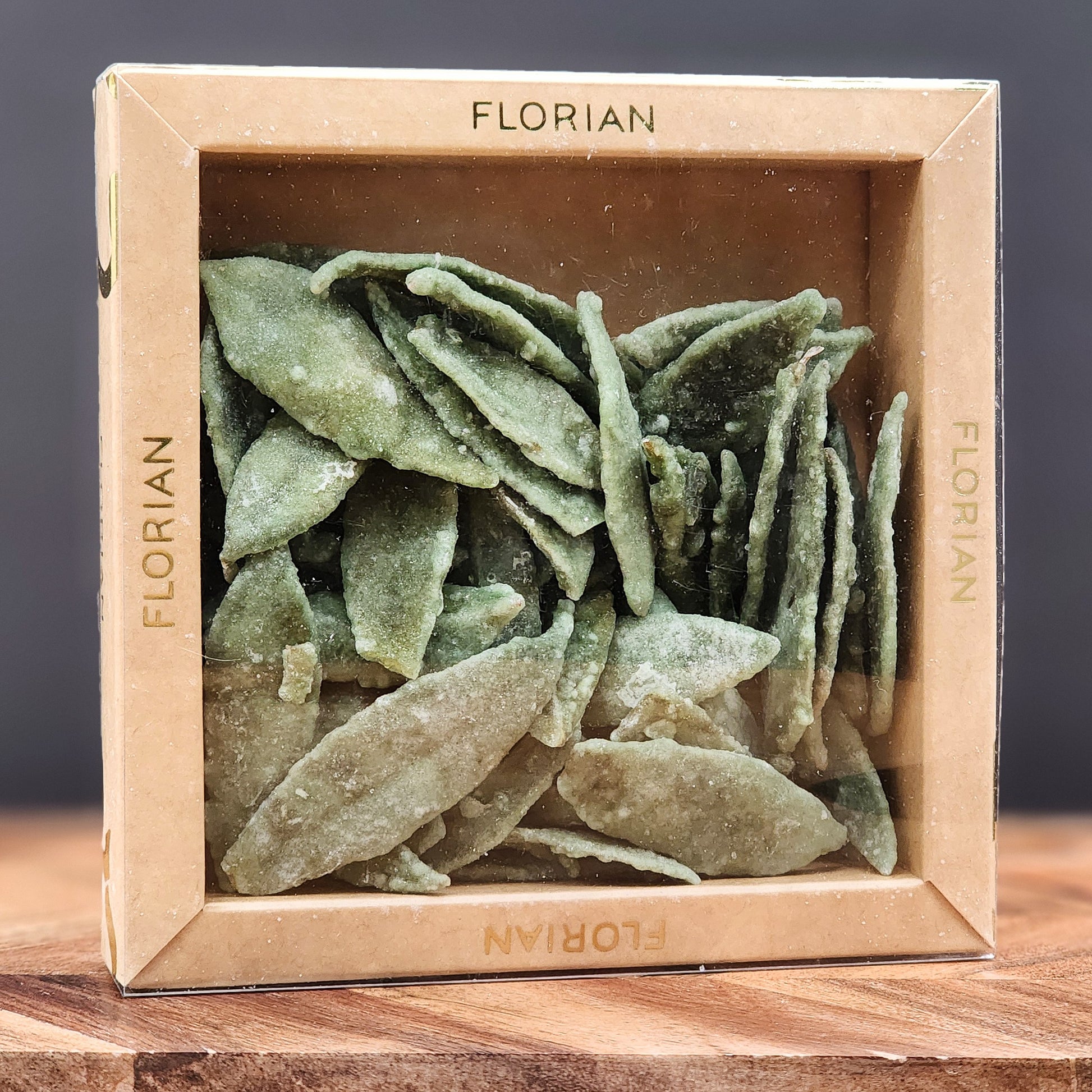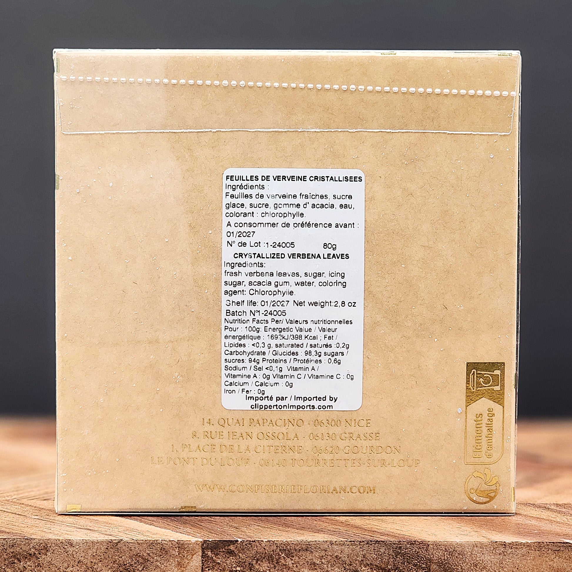 An elegant addition to your fine pastries, these crystallized verbena leaves would be just as home on a cheese platter as an entremet. Coated entirely in sparkly sugar crystals, these 1-to-1-1/2-inch leaves smell as lovely as they look, with the lemony tang of fresh verbena.