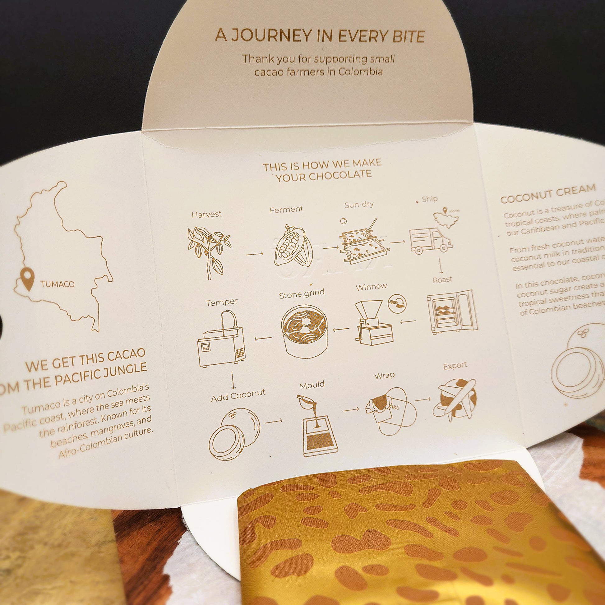 Crafted bean-to-bar in Colombia, this chocolate starts with cacao from Tumaco on Colombia's Pacific coast, carefully selected for its roundness and warmth. The addition of coconut milk softens the intensity of the cacao, creating a lush mouthfeel, while coconut sugar adds gentle caramel notes and a subtle tropical sweetness. Finely milled dehydrated coconut brings a subtle textural contrast and reinforces the bar’s sun-washed flavor profile.