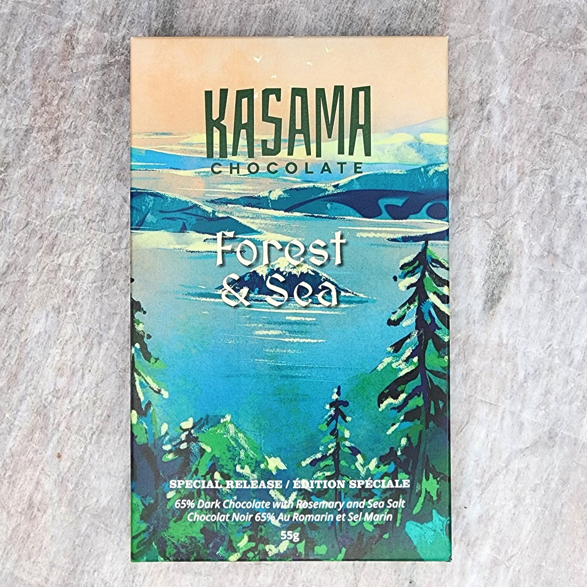 This marriage of the Forest and Sea came about as a tribute to close friends of the chocolate maker, with one part of the couple growing up on the coast and the other in the woods. To recreate the special notes of their union, Kasama combined whole rosemary with Pacific Ocean sea salt, infusing the blend into 65% dark chocolate from Ecuador.