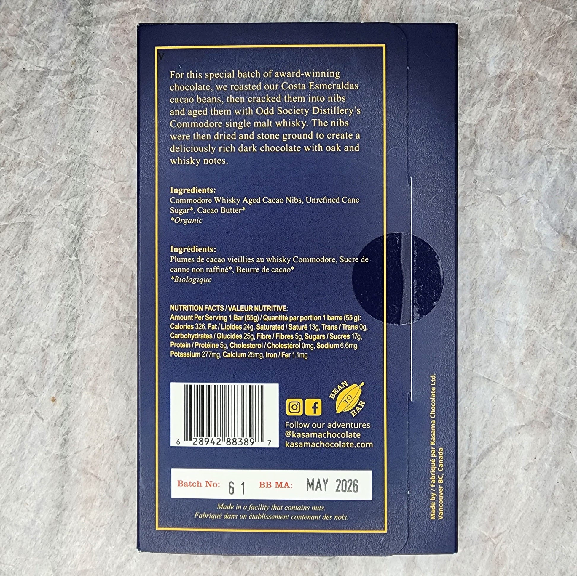 Kasama Chocolate has partnered with Odd Society Distillery in Vancouver, British Columbia, aging nibs from Costa Esmeraldas cacao beans in the distillery’s Commodore single malt whisky for four weeks. After drying the nibs, Kasama stone grinds them for an extra smooth bar. The result is a luxuriously creamy dark chocolate, rich with whisky flavors and oak barrel notes.