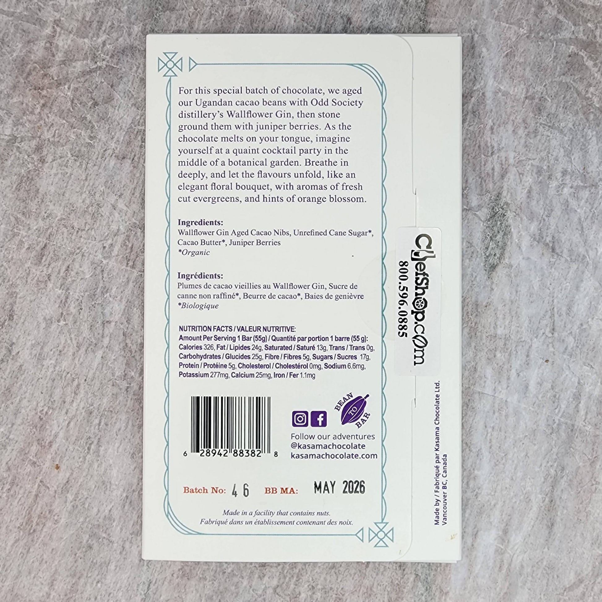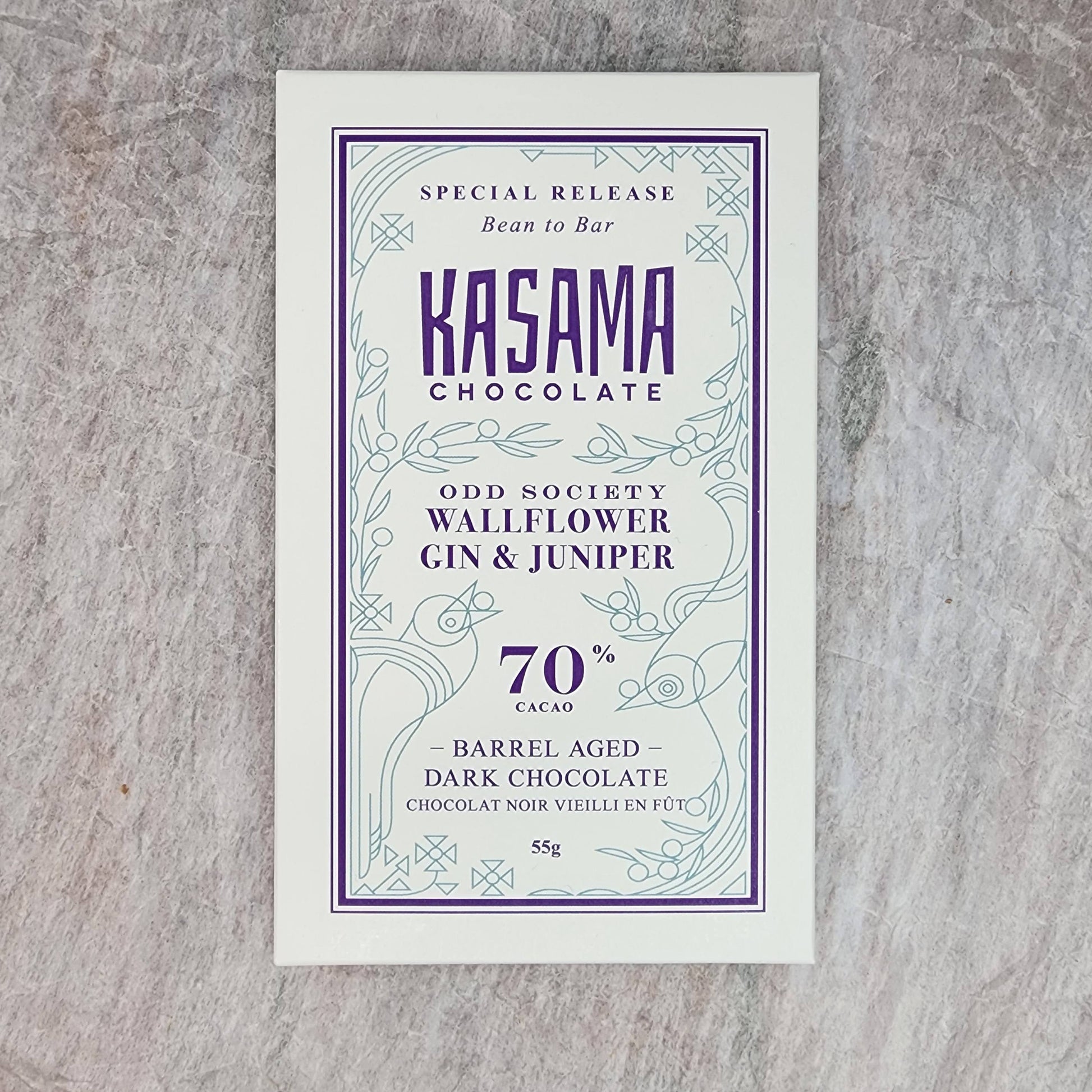 Kasama uses Papua New Guinea cacao from Karkar Island for this bar. The nibs are aged in an oak cask for 4 weeks with Odd Society Distillery's Wallflower Gin, then dried and stone ground with the juniper berries.