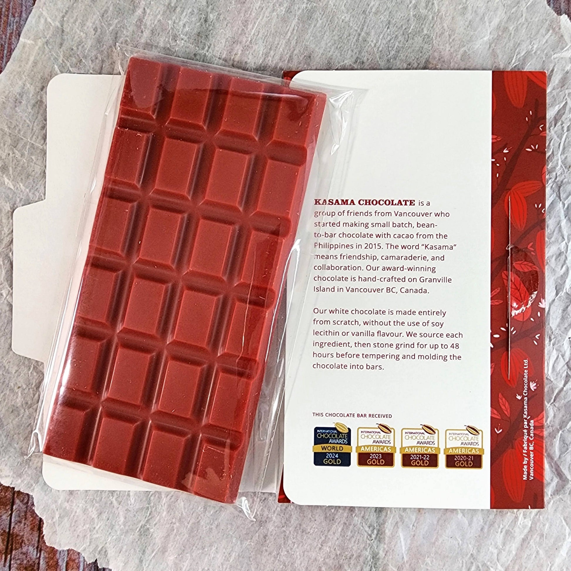 The Kasama Strawberry White Chocolate bar is bursting with fresh strawberry flavor! Kasama uses strawberries from British Columbia farms, picked at the peak of ripeness. With only Peruvian cacao butter and unrefined cane sugar—no dairy—an abundance of strawberry fruit shines through.