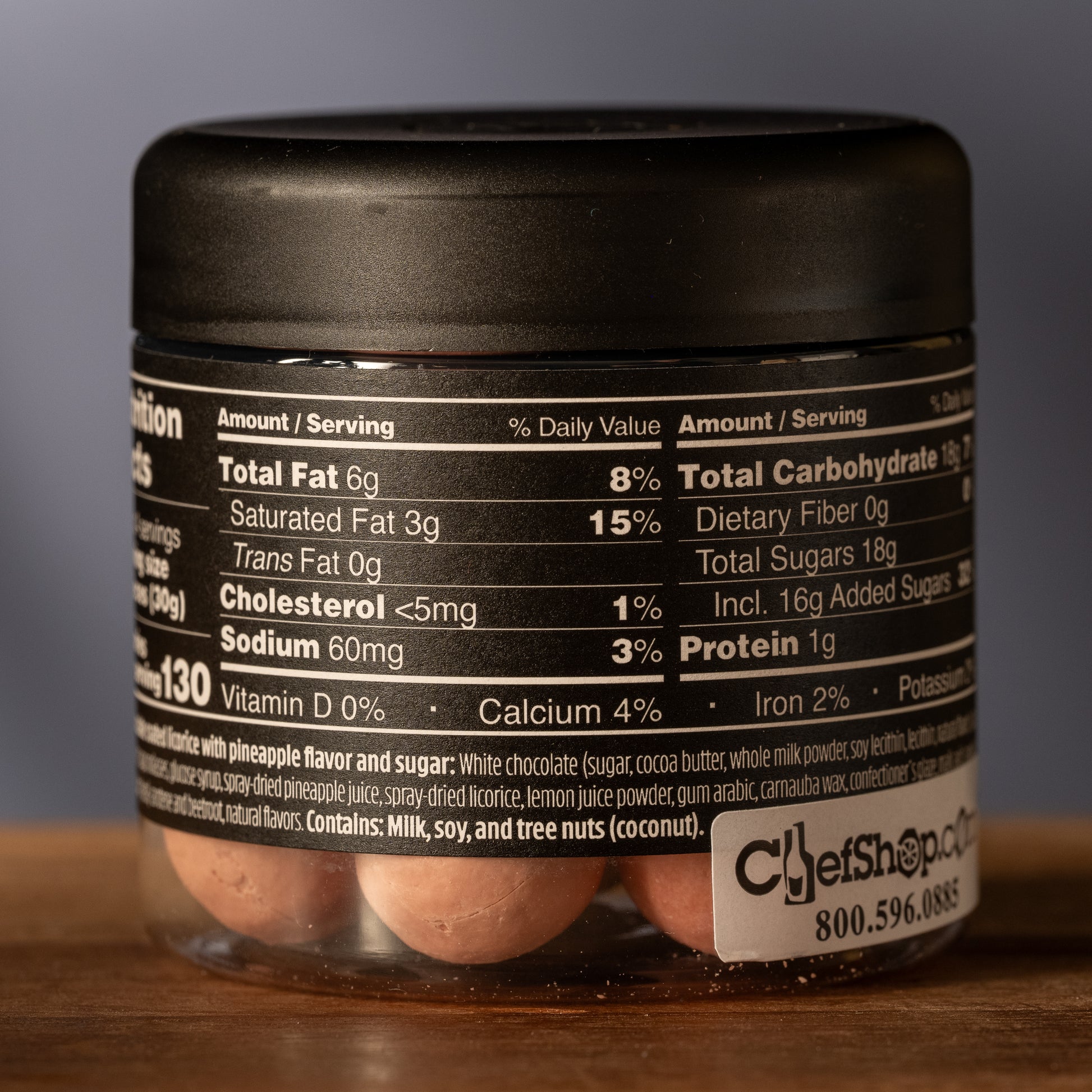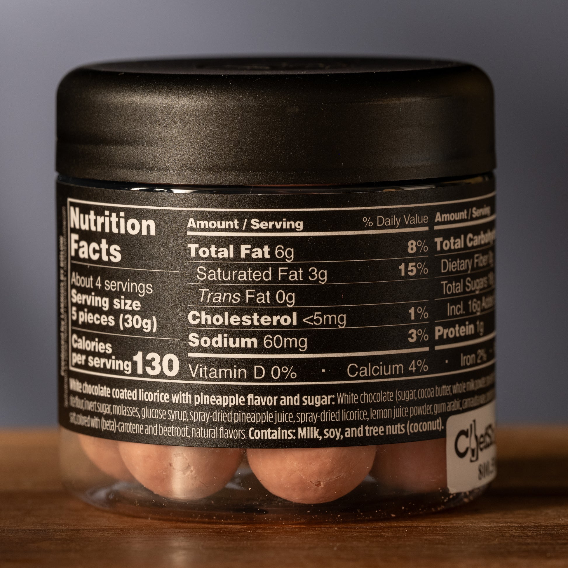 white chocolate (sugar, cocoa butter, whole milk powder, soy lecithin, lecithin, natural flavor), sugar, rice flour, glucose syrup, invert sugar, black currant concentrates, freeze-dried strawberry, malic acid, dried cranberries, spray-dried licorice, gum arabic, confectioners glaze, carnauba wax, natural flavors, lemon concentrate, colored with calcium carbonate and curcumin, spirulina concentrate, canola oil flavor