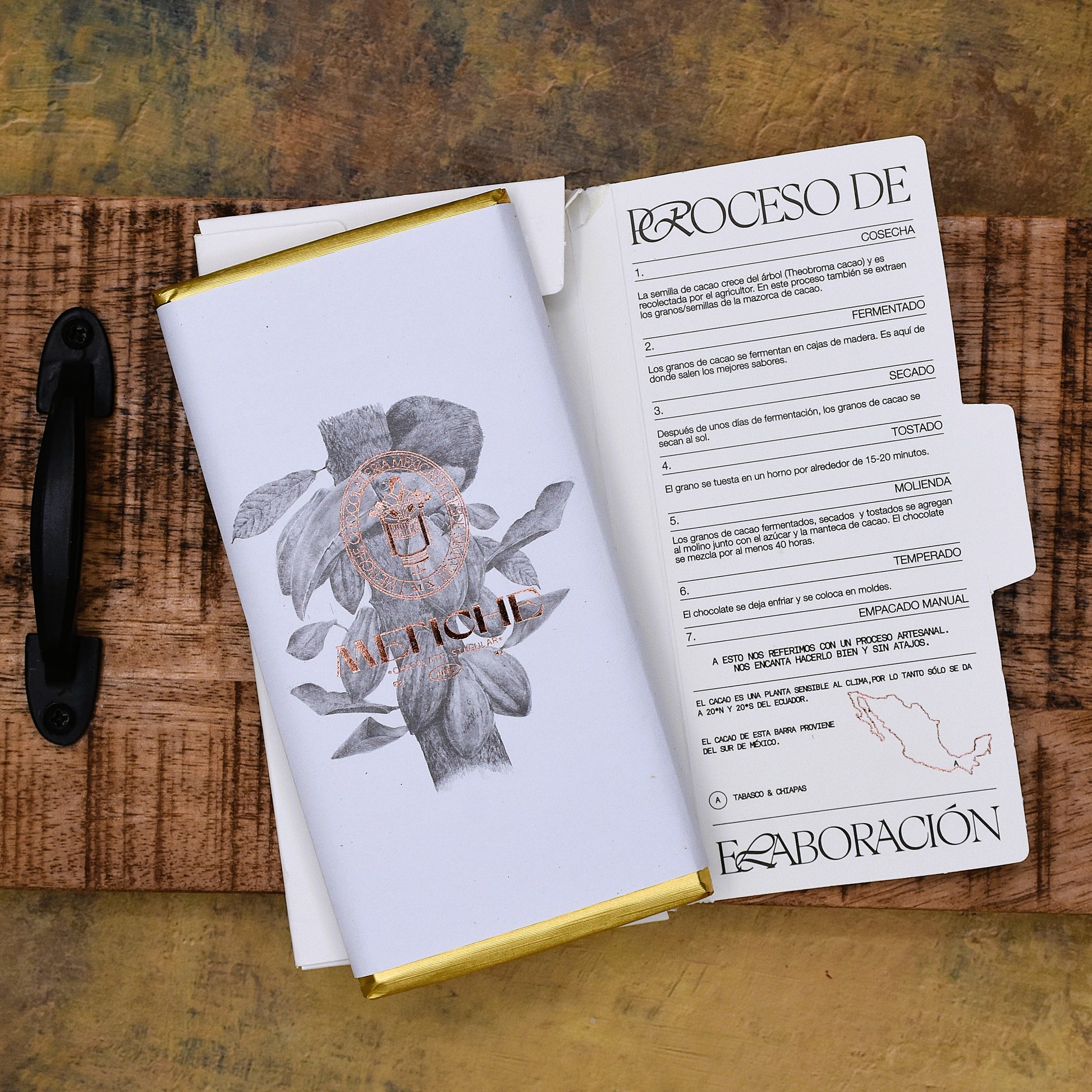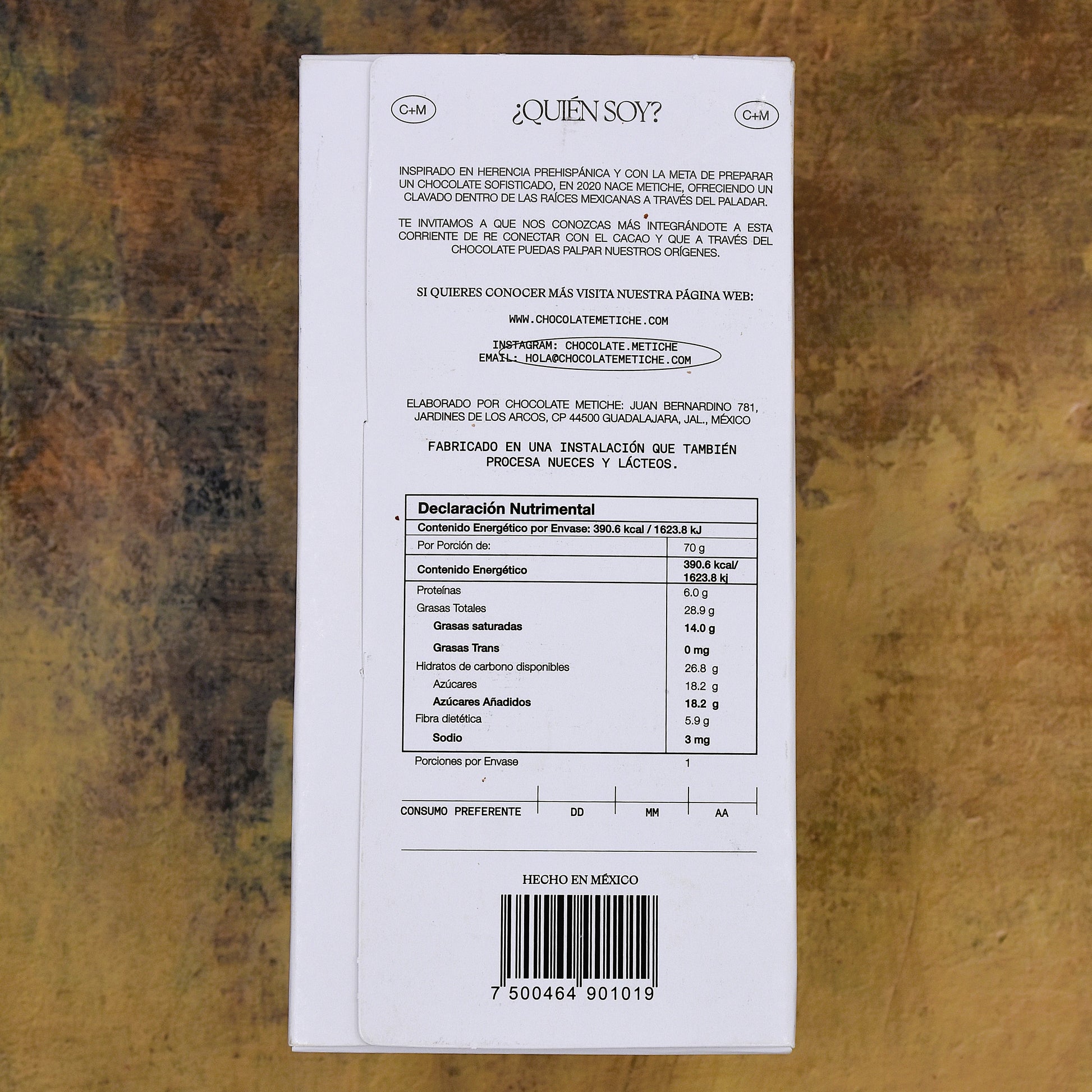Chocolate Metiche highlights the terroir of this single origin with minimal intervention, allowing the cacao’s natural complexity to shine. The flavor opens with caramel and floral notes, layered with dried apricot, before finishing with a pleasant astringency that invites another bite.