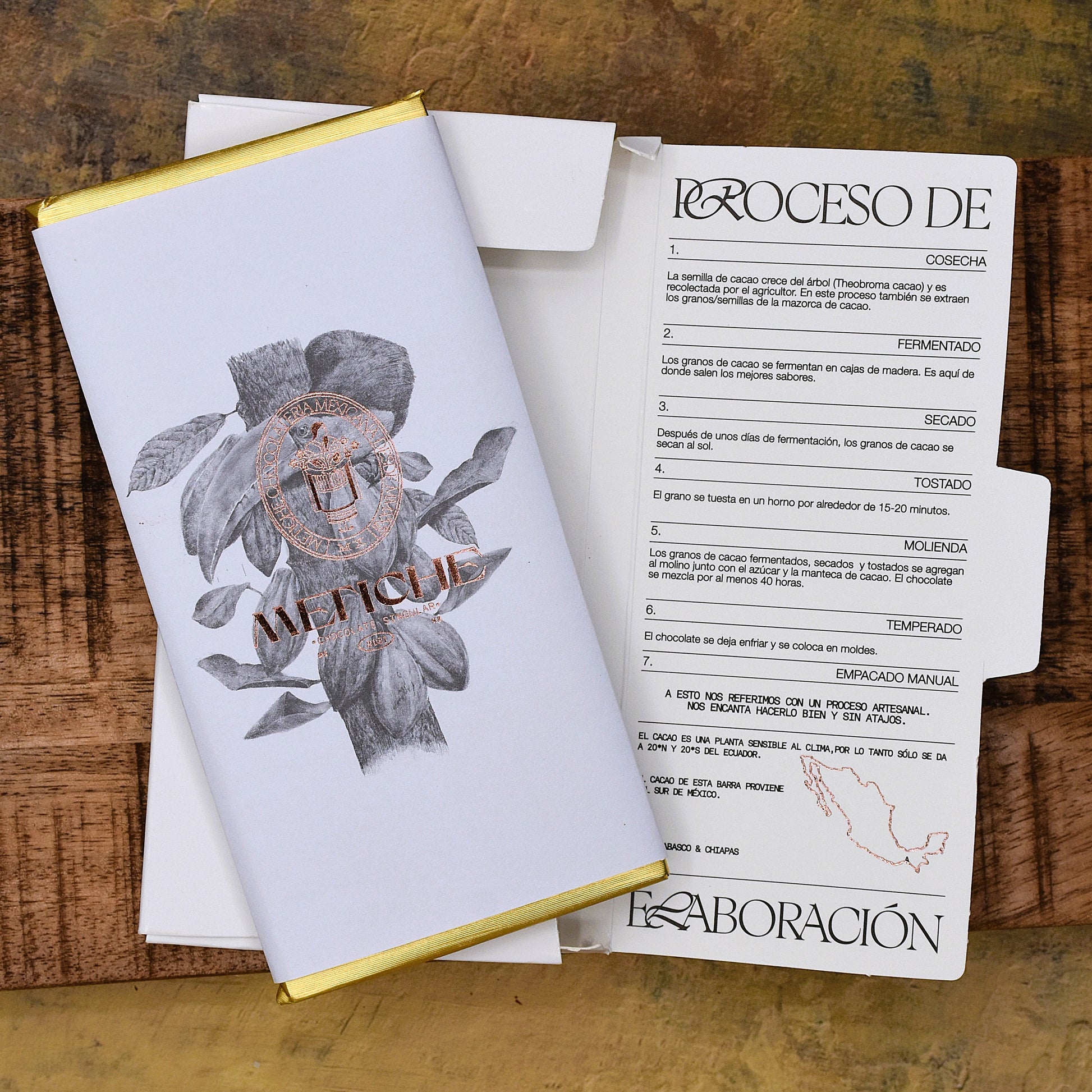 Chocolate Metiche reimagines a classic Mexican pairing in this 68% dark chocolate bar sweetened with piloncillo (also known as panela)—unrefined cane sugar traditionally molded into cones and used for centuries in Mexican kitchens.