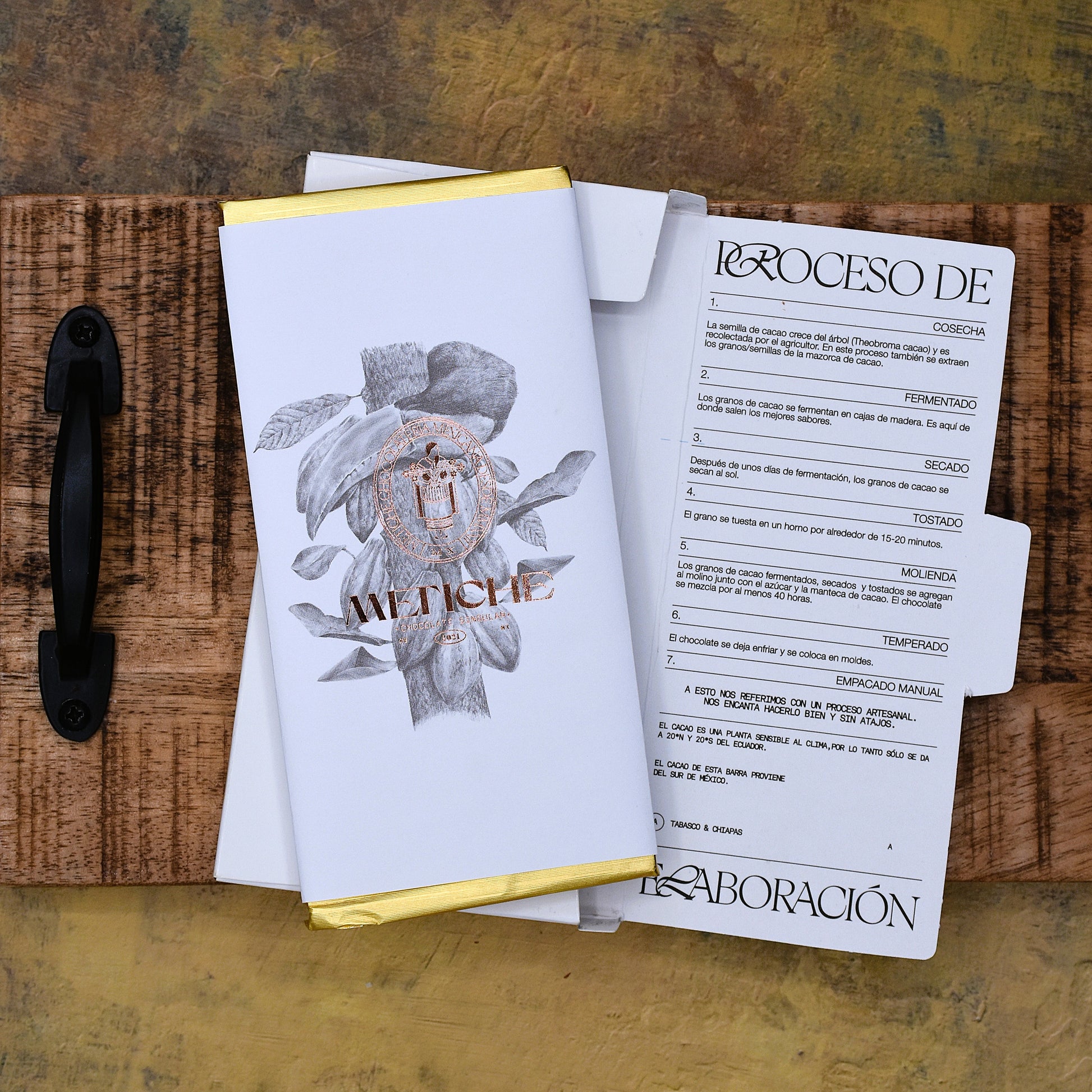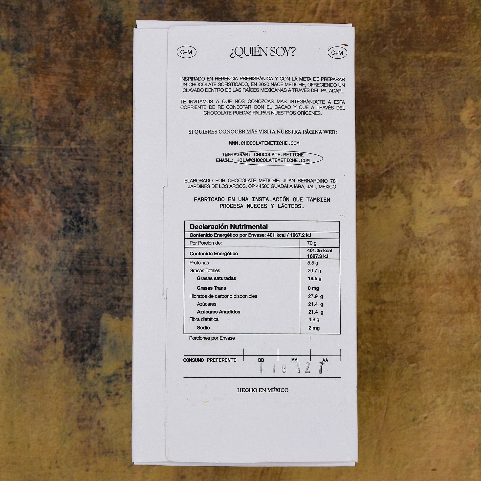 Classic flavors meet Mexican craft in this 74% dark chocolate bar, crafted with cacao from Finca Cuatro Hermanos in Tuzantán, Chiapas. Chocolate Metiche blends Trinitario, Criollo, and Forastero beans to create a robust chocolate base, then adds roasted almonds and candied orange peel for richness and brightness.